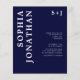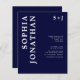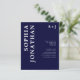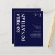 Bröllopspapper "All in One" med detaljerad modern fet typografi klassiskt marinblått monogram... Vårt prisvärda "All in One" marinblåa bröllopspapper har fet serif-typografi i kombination med sans serif-text för ett enkelt och modernt bröllopspapper med monogram. Baksidan av inbjudan innehåller alla detaljer som vanligtvis syns på separata kort i bröllopspaketet, inklusive tid och plats för mottagningen, boendealternativ, bröllopswebbplats, RSVP- och gåvoregisterinformation. Denna moderna bröllopsinbjudan utformades för att vara både trendig och budgetmedveten... för att inte tala om tidsbesparande. All exempeltext kan enkelt revideras med din egen information i personaliseringsmallen. Observera: du har möjlighet att köpa kuvert tillsammans med dina inbjudningar eller skaffa dina egna, om du har