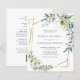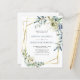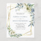 Bröllopspaket "All in One" Dusty Blue Eucalyptus Blommor Guld Geometrisk Ram Bröllopsinbjudan... Vår unika prisvärda "All in One" blommiga bröllopsinbjudan har eleganta vattenfärgblommor och eukalyptusarrangemang i vitt och nyanser av dusty blue på en geometrisk guldbård som ramar in din inbjudan text. Baksidan av inbjudan innehåller alla detaljer som du vanligtvis ser på separata kort i bröllopspaketet. Denna moderna stil för och bak bröllopsinbjudan designades för att vara både elegant och budgetvänlig... för att inte tala om tidsbesparande. På baksidan finns också en QR-kod grafisk mall som du kan ersätta med din egen kod (eller ta bort om du inte planerar att använda en... glöm inte heller att ta bort texten som hänvisar till
