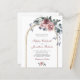 Bröllopspaket med vinterrosor och eukalyptus i guld välvd inbjudan... Våra prisvärda "allt-i-ett" blomstergestaltade vinterbröllopsinbjudningar har en förgylld valvform med en vacker bukett av rosa och vinröda rosor och eukalyptusgrönska som ramar in texten på bröllopsinbjudan. Baksidan av inbjudan innehåller alla detaljer som vanligtvis återfinns på lösa kort i brölloppspaketet. Denna moderna bröllopsinbjudan är designad för att vara både elegant och budgetvänlig... för att inte tala om tidsbesparande. På baksidan finns också en QR-kod i grafisk mall som du kan ersätta med din egen kod (eller ta bort om du inte planerar att använda en). All exempeltext kan enkelt ersättas med