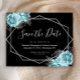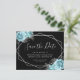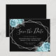 This elegant budget wedding save-the-date card features a silver geometric frame decorated with aqua and silver flowers on a black background. The customizable text combines silver gray whimsical handwriting, copperplate and italic fonts.