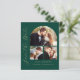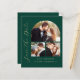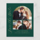 Det här enkla, minimalistiska Save the Date-kortet har en fotokollagebåge med ett horisontellt foto högst upp och två fyrkantiga foton nedanför. Orden "Save the Date" löper vertikalt upp längs den vänstra marginalen i elegant, guldliknande handskriven text. Paret namn, datum och stad visas nedanför fotokollaget i typsnittet sans serif på en smaragdgrön bakgrund. Lägg till ett mer detaljerat meddelande med ytterligare information på baksidan, tillsammans med en QR-kod som hjälper dina gäster att besöka er bröllopssida.