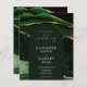 Denna moderna design har en mörkgrön arkform på en bakgrund av jägare grön akvarell agat med guld falskt glitter. Ordet "bröllop" visas i elegant vit script. Anpassa inbjudan med namnen på bruden och brudgummen i en kombination av seriffer och sans serif typografi och bröllopsdetaljer i kursiv.