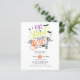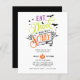 Med ord "Eat, Drink och Be Scary" i ett lila, orange, kalkgrönt färg och retrotypografi stil och med fladdermöss, måne, nät och en liten spindel över vit bakgrund är dessa inbjudningar från Halloween fest perfekter till inbjudan era vänner och familj! Anpassa med dina Halloween fest-detaljer under i vit text på svart bakgrund. Färg är utbytbart!