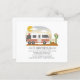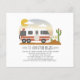 Äventyrsinspirerad neutral unisex baby shower med illustration av gul och vintage husbil med barnkläder hängande på tvättlina fäst vid kaktus i öken soluppgång med sol och moln. texten säger "äventyret börjar"
