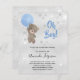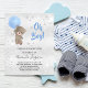 För en babydusch som firar en pojke. En faux silver metallisk tittar bakgrund. En nalle med blå ballongstjärnor och faux glitter damm. Anpassa och lägg till närmare uppgifter om namn i mamma och party. Namn och texten: Oj, det står ett handskript till stil