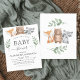 Budgeterade trädjur - Bear, Racoon, Fox Eucalyptus Grey Botanical Watercolor Vår Kön Neutral Pojke eller Flicka Baby Shower-inbjudningar på vit bakgrund - innehåller vackra och elegant manustypografi med moderna botaniska löv och grönt för att speciella Mor ska vara firande.