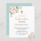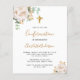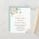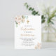 En vit bakgrund dekorerad med eucalyptusgrönska, en vit peoni, gyllene blad. Personifiera med namn och ceremoniinformation. Svarta och gyllene bokstäver.