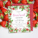 Det här är en söt jordgubbsbaserad och budgetvänlig babyduschinbjudan med ett ram av jordgubbar, vita blommor och grönska. Den kompletteras med en roligt handskriftsbild av stil typografi och ett sött jordgubbsfrö på baksidan. Perfekt för en flicka baby och vår till firande sommaren.