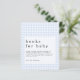 Ett budgetpris mindre 4,5” x 5,6” alternativ. Den MATT YTBEHANDLADE 80 g papperstypen är tunnare (perfekt för omslag), alternativt finns den i en HALVMATT 110 g KORTKVALITÉ (perfekt för inbjudningar). Kuvert är ett tillval och är något större än kortets storlek. Blue Gingham Books for Baby-omslag. Baby Boy. Rubriken är stor i snyggt gemena med detaljerna längst ner på ett opacitetslager som överlagras på den ginghambakgrunden. Anpassa enkelt texten till dina egna detaljer.