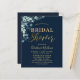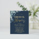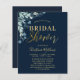 Elegant bröllopsfest inbjudan. Med detaljer av rustik lövverk och små blå blommor på en marinblå bakgrund med modern faux-guld kalligrafi. Lätt att skapa din egen med hjälp av personaliseringsverktyget.