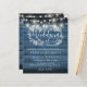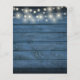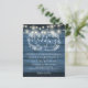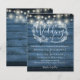 Med vackra lampor och en handritad blomsterkrans, kan denna eleganta budget rustika bröllopsinbjudan anpassas med din information i chic bokstäver på en blå träpanel bakgrund. Designad av Thisisnotme©