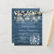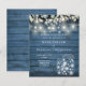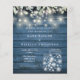 En stilren budget bröllopsinbjudan med fina strängljus, murbrukskrukor och salvia- och lila blad som faller över en blå rustik trähuvudbakgrund. Designad av Thisisnotme©