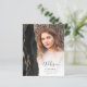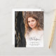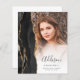Trendigets tillkännagivande från 2025 i studenten innehåller en svart vattenfärgad agate geode gräns med fokus på faux guld glitter. Student först namn visas som ett handskriftsskript för elegant charcol grått på ett lodrät-foto, tillsammans med efternamnet, skolåret och klassåret i typsnittet. Ett vitt övertoningsfilter hjälper till att visa texten. Ett andra foto visas på baksidan, tillsammans med meddelandet och detaljerna i grått-texten från kol på vit bakgrund.