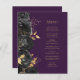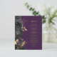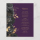 Den här elegantens moderna bröllop-meny har en gräns av svarta blommor och guld faux foil löv. Anpassa guld-färgad kursiv text på mörkens lila. Baksidan av menyn är solid lila.