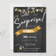 Den enkla, minimala, svarta och vita, överraskande digitala inbjudan till födelsedagsfesten med träbakgrund och guld-plåt.
