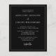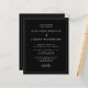 Den här enkla, minimalistiska, moderna bröllopsinbjudan innehåller klassiskt vitt serif-teckensnitt på en svart bakgrund, med markerad ord och fraser i snyggtens handskriftscalligrafi. Med en tunn vit linje får du en rektangulär ram för texten. På baksidan lägger du till information om bröllop och en QR-kod som gästerna kan söka igenom för att besöka webbplatsen för bröllop. Obs! Kuvert inkluderas inte automatiskt i dessa budgetinbjudningar, så kom ihåg att välja alternativet "vita kuvert"!