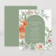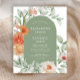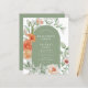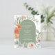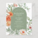 Denna romantiska bröllopsdesign har en båge i sagegrön färg omgiven av vackra persikafärgade vattenfärgblommor och grön lövverk. Anpassa inbjudan med namnen på bruden och brudgummen i en kombination av serif- och sans serif-typografi och bröllopsdetaljer i sans serif och kursiv stil. Baksidan är i en solid sagegrön färg. Perfekt för ett vår- eller sommarbröllop.