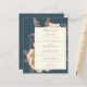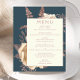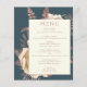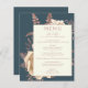 Denna eleganta bröllopsmeny har en frodig, romantisk blomsterbukett i elfenben med roséguld falskt folie och glitterlöv på en teal bakgrund. Anpassa den rosaröda texten i snygga typsnitt på en elfenbensfärgad rektangel. Baksidan av kortet är enfärgat teal.
