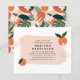Denna moderna och stilrena design har en rosa penseldragsoverlay, en falsk gyllene touch på båda sidor, två apelsiner och mjuk vit apelsinblomma. Designen inkluderar en chic layout med brudens namn i feta versaler, olika delar av evenemangsinformationen i ett handskrivet script-teckensnitt och sommar-tema mönster. Baksidan av korten har ett bohemiskt mönster av abstrakta geometriska former, tropiska palmlövsblad och monstera blad, papaya, apelsiner, vita blommor med mera. Ändra formuleringen genom att välja "Anpassa denna mall". Som en del av budgetvalet på Zazzle är detta ark inte av standardstorlek för inbjudningar eller av standard papperskvalitet. Om du vill ha denna design på ett inbjudningskort kan du hitta den i vår butik eller använda Zazzle Make Machine för att överföra den till den produkt du
