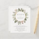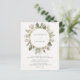 I inbjudan till elegant bröllop finns en guld-cirkel omgiven av en blommigt med vattenfärg som illustrerar elfenben ro och grönt på en benvit bakgrund. Anpassa texten för kol-grått med bröllop-informationen. Den omvända sidan är en koordinerande skugga av benvit.