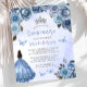 Denna vackra quinceañera-inbjudan har en gräns av blått ro med silver faux glitter blad i blå vattenfärg. En silver tiara, en mörk-ordförande i en blå prinsessa-klänning och små blå fjärilar dekorerar texten. Ord "Quinceañera" och hedersgästens namn visas i elegant blått handskriftsskript, med den återstående texten i grått sans serif font.
