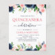 Budget Eleganta och Moderna Rosa och Marinblå Blommor Blommig Quinceanera Firande Fest Inbjudningar inkluderar vacker och elegant skript typografi med moderna botaniska rosa blommor och marinblå för den speciella 15-årsfirandet.