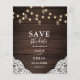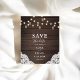 Budgeten Boho chic bröllop spara datum-flygare har mason burk och string ljus på trä.