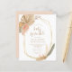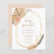 Trendiget Bho baby sprinkle-inbjudan innehåller en guld-geometrisk ram som dekoreras med vattenfärgade tropiska löv i handflatan och pampasgräs i nyanser av beige, persika och muterad grönt. Anpassa beige-texten med information om babyduschen. Den omvända sidan är en koordinerande skugga av fast persikofärgat beige.