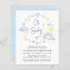 Den budgetvänliga och grumliga duschinbjudan i pojke som innehåller boho-inspirerad pastellblått och gult-vattenfärger från en regnbåge, sol, hjärtan, stjärnor, måne och moln och "Oh Baby!" i ett kalligrafiskt skript för snyggt.