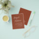 Budgetera Anpassa den här Boho Simple Elegant Terracotta Burnt Orange and White Snyggt-inbjudan med ditt meddelande och detaljer på baksidan. Denna minimalistiska inbjudan omfattar handskrivet manustypografi med snyggt med ett modernt färg för den speciella Bröllopsdagen firande.