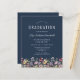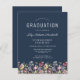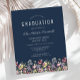 En vacker vattenfärgsblommigt gräns av vilda blommor dekorerar grund kant i det här trendiget boho studentfest inbjudan. Anpassa den vita texten på en marin blå bakgrund med student namn i handskriftsskript, skolåret och klassåret i sans serif samt datum, plats och OSA i serif-teckensnitt. Kortets baksida är fast marin blå.
