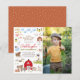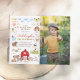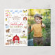 Fira din lilla bondes stora dag med denna födelsedagsinbjudan! Den vänstra sidan av denna budgetinbjudan till födelsedagsfest har en ram full av charmiga illustrationer av lantbruksdjur. Det finns två små grisar, en familj av ankor, kor, kaniner, en häst och en åsna, getter, några får, en katt och en hund, ett hus fullt av höns och en stor röd lada. Inuti ramen står det "Nöff, kvack, mu & vrinsk" och en inbjudan till födelsedagsfesten. Födelsedagsbarnets namn är skrivet med röda skrivstil-bokstäver med deras ålder under i gröna versaler. Evenemangets detaljer är tryckta nedan i enkel serif-typografi. På höger sida av inbjudan finns ett anpassat foto som du väljer. Denna födelsedagsinbjudan för alla åldrar är perfekt för resor till djurparken, firande på en lokal gård och fester med lada-tema. Som en del av budgeturvalet på Zazzle är detta ark inte en standardstorlek för inbjudningar eller papperskvalitet. Om du vill ha denna design på ett inbjudningskort kan du hitta den i