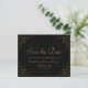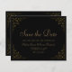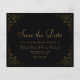 Denna eleganta vintage-inspirerade formella bröllop "save the date"-kort har texten i guldfärgad script- och serif-teckensnitt, infattad av ett delikat vintage-guld vinstocksmotiv på svart bakgrund. Ramverket upprepas på baksidan.