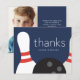 Detta könsneutrala, moderna tackkortet har bowlingkäglor och bowlingklot, vitt tackmeddelande och namn. Baksidan har ett foto och personligt meddelande. Klicka på redigeringsknappen för att anpassa denna design.