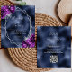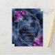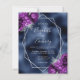 Denna eleganta moderna bröllopsinbjudan har en silvergeometrisk ram dekorerad med lila och silverblommiga buketter på en marinblå falsk folie bakgrund. Den anpassningsbara texten kombinerar silvergrå fantasifull handskrift, kopparplåt och kursiva teckensnitt. Lägg till ytterligare detaljer på baksidan, tillsammans med en QR-kod för att hjälpa dina gäster besöka din bröllopswebbplats.