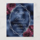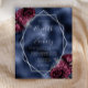 Denna eleganta moderna bröllopsinbjudan har en silver geometrisk ram dekorerad med burgunder och silver blomsterbuketter på en navyblå falsk folie bakgrund. Den anpassningsbara texten kombinerar silvergrå fantasifull handskrift, kopparplåt och kursiva teckensnitt.