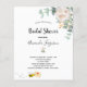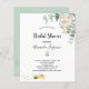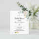 En inbjudan till en blivande brud. En chic vit bakgrund. Dekorerad med vita akvarellmålade blommor (peony) eukalyptusgrönska, blad och småkvistar, och en söt glad leende bin som bär på ett kuvert. Anpassa och lägg till ett namn och festdetaljer. Svarta bokstäver. Texten: Bröllopsfirande och namnet på den blivande bruden är skrivna med en modern handskriven stilsnack. Baksida: grön bakgrundsfärg och det glada leende bin.