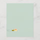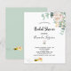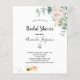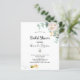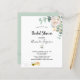 En inbjudan till en blivande brud. En chic vit bakgrund. Dekorerad med vita akvarellblommor (peony) eukalyptusgrönska, blad och småkvistar, och en söt glad leende bin som bär ett kuvert. Anpassa och lägg till ett namn och festdetaljer. Svarta bokstäver. Texten: Bröllopsfest och namnet på den blivande bruden är skriven med en modern handskriven stilsnack. Baksida: grön bakgrundsfärg och det glada leende bin.