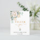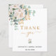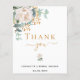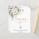En modern och elegant tackkort för bröllopsfest. En chic vit bakgrund. Dekorerad med en vit blomma, blomma (peony) och gröna akvarellmålade eukalyptusblad, kvistar, grönska och en falsk guld kvist. Svarta och gyllene bokstäver. På framsidan texten: Tack, namn och datum.