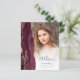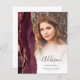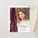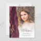 Trendigets tillkännagivande från 2025 i studenten innehåller en burgundröd vattenfärg som agerar i gräns med utsmyckningar från guld glitter. Student först namn visas som ett handskriftsskript för elegant charcol grått på ett lodrät-foto, tillsammans med efternamnet, skolåret och klassåret i typsnittet. Ett vitt övertoningsfilter hjälper till att visa texten. Ett andra foto visas på baksidan, tillsammans med meddelandet och detaljerna i grått-texten från kol på vit bakgrund.