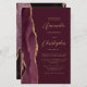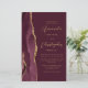 Den här elegantens lämnat kant har en modern bröllopsinbjudan med en burgundröd vattenfärgad agat gräns som trimmas med faux guld glitter. Anpassadet kombinerar skript av guld-färgad och sans serif typsnitt på en burgundisk bakgrund. En matchande burgundagatdesign visas på baksidan av kortet.