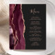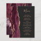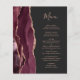 Den moderna bröllopsinbjudan från elegantens lämnat kant har en burgundisk vattenfärgad agat gräns som trimmas med faux ro guld glitter. Anpassadet kombinerar handskriftsskript för ro rosa och typsnitt för kopieringsskylt på en baksida som inte är svart. Den bakomliggande sidan har en matchande burgundisk och ro guld agate-design.