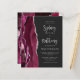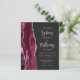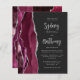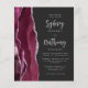 Den vänstra kanten på denna eleganta moderna bröllopsinbjudan har en burgunderfärgad akvatint agat-kant med silverfärgad falsk glitter. Den anpassningsbara texten kombinerar silvergrå kalligrafiskrift och sans serif-teckensnitt på en mörk bakgrund. Baksidan har en matchande burgunderfärgad och silverfärgad agat-design.