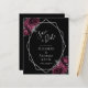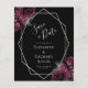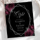 Det här moderna bröllop spara datum-kortet i elegant har ett silver-geometriskt ram som är dekorerat med burgundi och silver blommigt buquets på en svart bakgrund. I anpassadet kombineras silver grått med fysisk handskrift, tryckplåt och kursivt typsnitt. Den omvända sidan är helsvart.