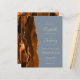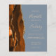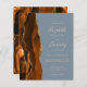 Den lämnat kant i eleganten i den moderna bröllopsinbjudan innehåller en bränd vattenfärgad orange i gräns som trimmas med faux guld glitter. Anpassadet kombinerar handskrift, rityta och kursivt typsnitt i blek guld-färgad med en dammig blå bakgrund. Den omvända sidan har en matchande bränd orange och guld agate-design.