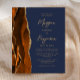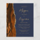 Den lämnat kant i eleganten i den moderna bröllopsinbjudan innehåller en bränd vattenfärgad orange i gräns som trimmas med faux guld glitter. Anpassadet kombinerar skript av guld-färgad och sans serif typsnitt på en mörk marin blå bakgrund. Den omvända sidan har en matchande bränd orange och guld agate-design.