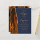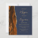 Den lämnat kant i eleganten i den moderna bröllopsinbjudan innehåller en bränd vattenfärgad orange i gräns som trimmas med faux guld glitter. Anpassadet kombinerar skript av guld-färgad och sans serif typsnitt på en mörk marin blå bakgrund. Den omvända sidan har en matchande bränd orange och guld agate-design.