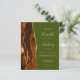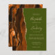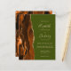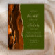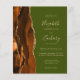 Den lämnat kant i eleganten i den moderna bröllopsinbjudan har en bränd orange och en brunt vattenfärgad agat gräns trimmad med faux guld glitter. Med anpassadet text kombineras inte handskrift, tryckplåt och kursivt typsnitt på oliv grönt bakgrund. Den omvända sidan har en matchande agate-design.