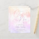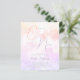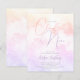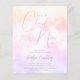 En elegant, vismisk och drömmande inbjudningskort för möhippan med vattenfärgade moln i pastel färg av lila och rosa gult med ett kalligrafiskt skript som säger "hon ligger på molnet nio".