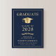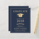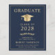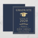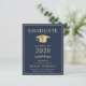 Elegant och prisvärd mörkblå college-examensinbjudan med en guldfärgad examensmössa och modern ljusguld typografi för examenets namn, årskurs, högskola eller universitet, examen och huvudämne eller utmärkelser.